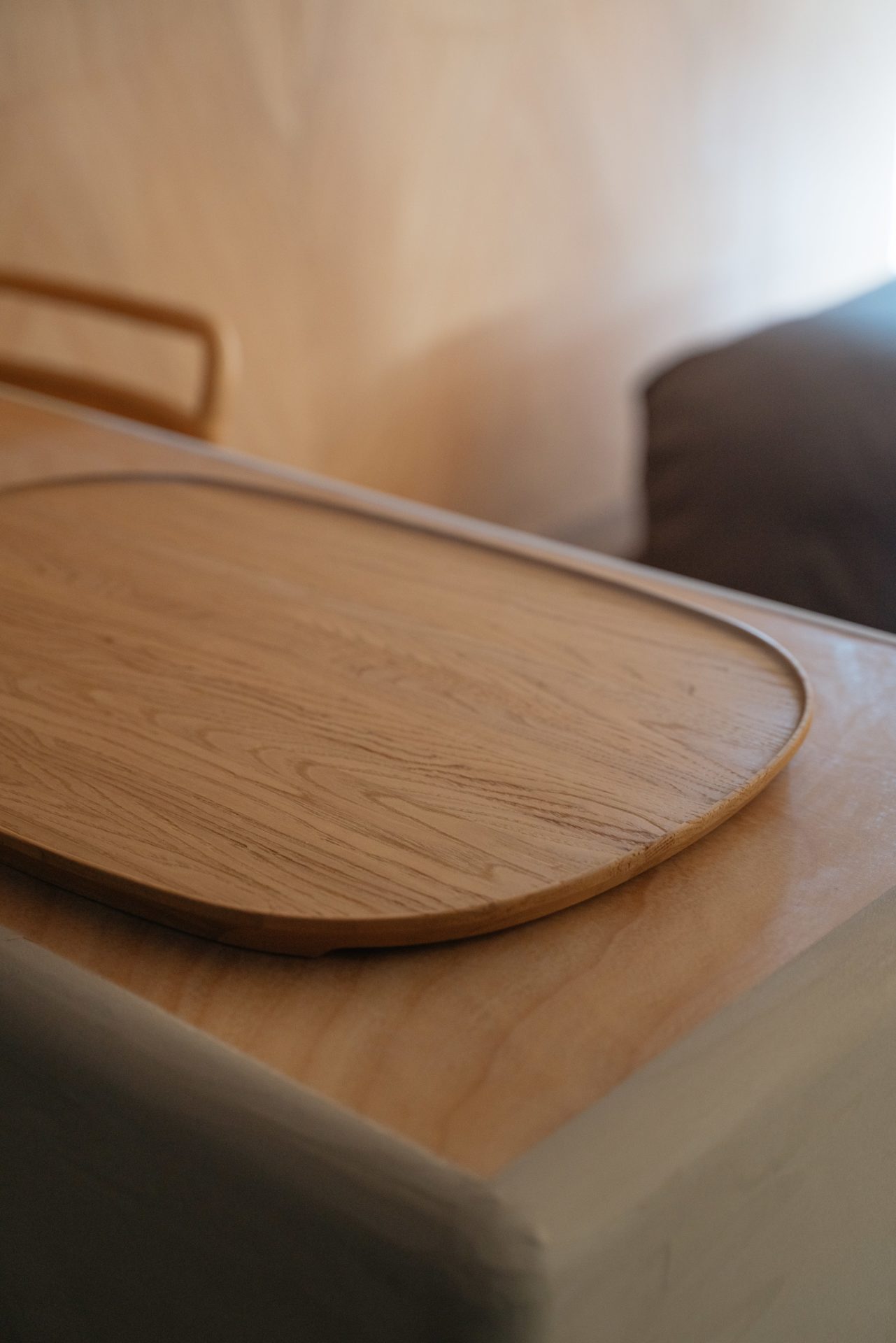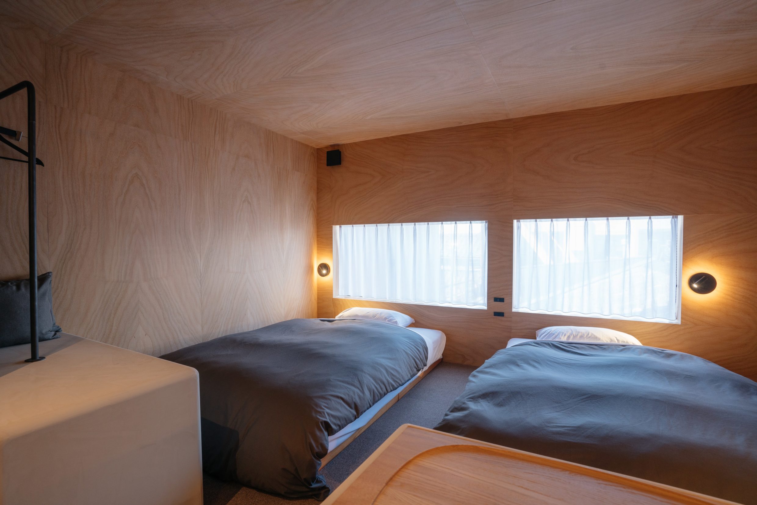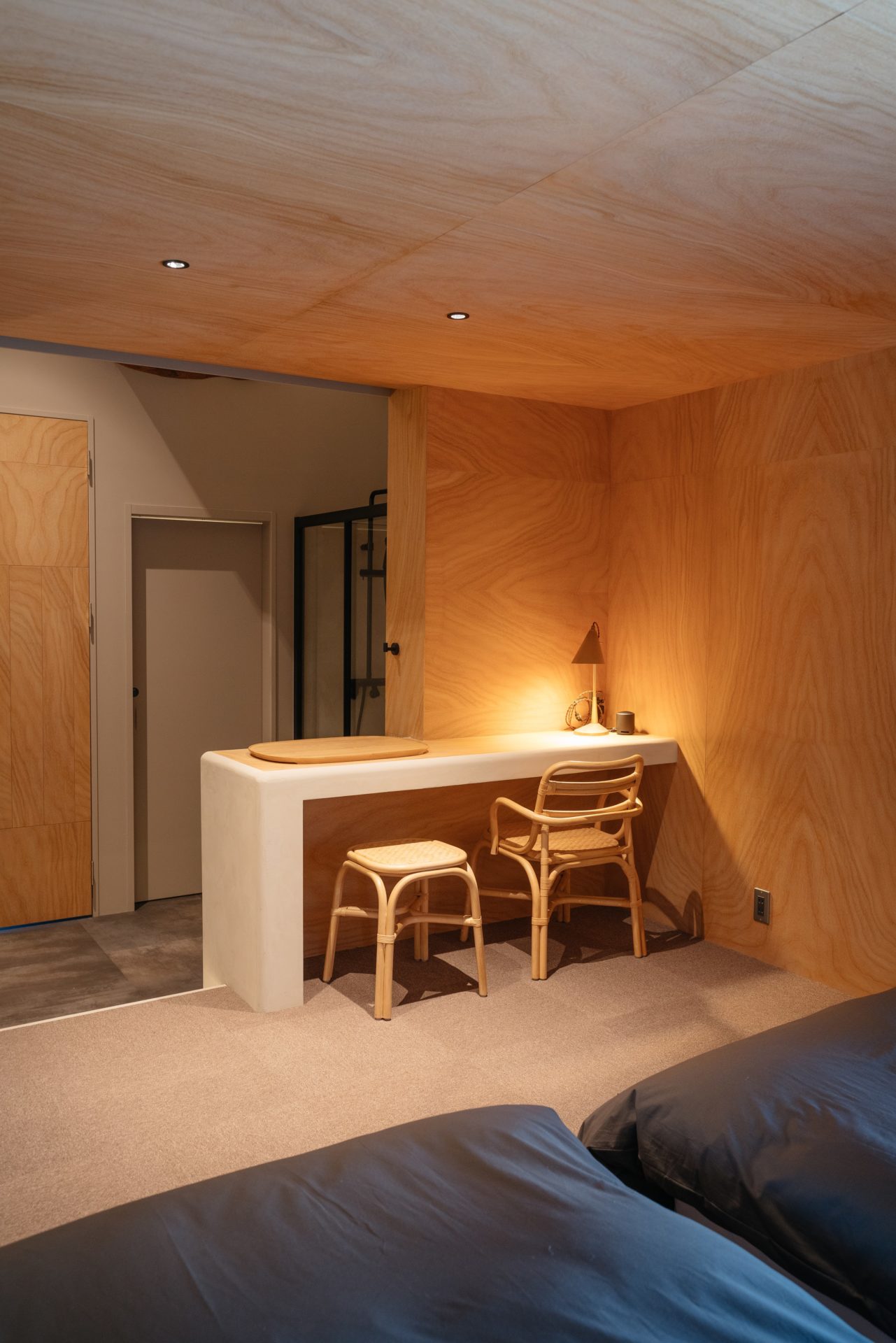 まさに「暮らす」という滞在体験を体現すために、1棟貸しのBed and Craftのようなギャラリーに泊まる特別な体験とは違い、長期連泊でもストレスなく滞在できるように、シンプルな設えでありながらも内装には木彫刻でよく使用される楠木(くすのき)を用いたツキ板を内装材として使用、楠木の爽やかな香りが部屋全体を包み込み安眠効果にも繋がっている。